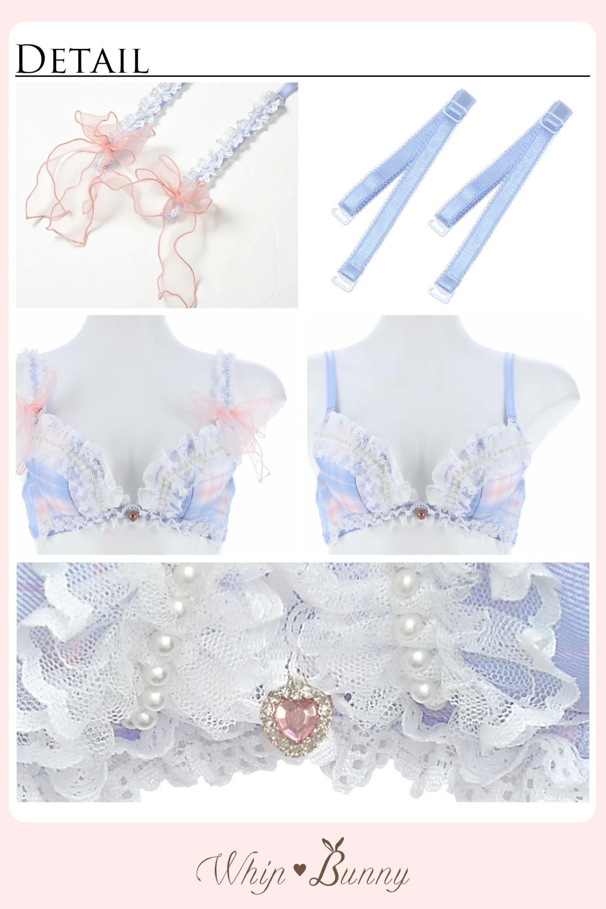 カップのホワイトレースフリルには立体的なパールが!大きなピンクのオーガンジーリボンはストラップお洋服に合わせて、通常ストラップと取り換えできます!