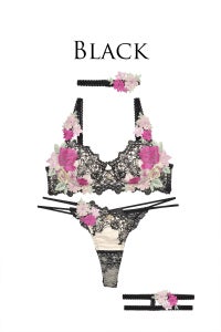 貴婦人のドレスをイメージした繊細な刺繍レースをブラジャーカップとアンダー部分にたっぷりと使い、さらに上からこれでもかというほど大きなフラワーモチーフをあしらいました。