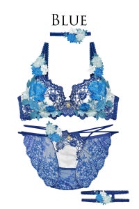貴婦人のドレスをイメージした繊細な刺繍レースをブラジャーカップとアンダー部分にたっぷりと使い、さらに上からこれでもかというほど大きなフラワーモチーフをあしらいました。