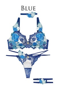 貴婦人のドレスをイメージした繊細な刺繍レースをブラジャーカップとアンダー部分にたっぷりと使い、さらに上からこれでもかというほど大きなフラワーモチーフをあしらいました。