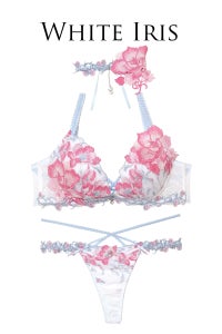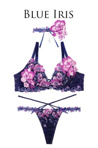 アイリスの花をイメージした爽やかなシリーズ。ラメ入りの艶やかで美しい刺繍レースに、お揃いのケミカルレースとアイリスの花を模した大きなモチーフを使用した豪華なデザイン!