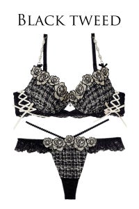 毎年大人気のツイード生地のランジェリーが今年も登場♪高級感たっぷりゴールド糸が輝くツイード生地に薔薇のコサージュをイメージしたケミカルレース、花の中心にはビジューストーンつきでキラキラ輝きます◎