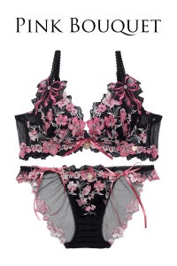 両カップ脇には、レースとリボンを刺繍したチュールモチーフをあしらい、ブラジャー中心には大粒のラインストーンがきらめくアクセントに◎