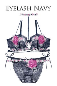 繊細なアイラッシュレースに大きな薔薇モチーフをあしらい、全体に蝶々と小花のケミカルレースを施したラグジュアリーなシリーズ。