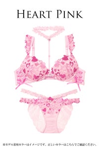 ラブリーなハートランジェリーの登場です♪色んな色のハートを詰め込んだ刺繍レースに編み上げデザインをプラス。肩にも小さいハート刺繍のフリルをたっぷりと…