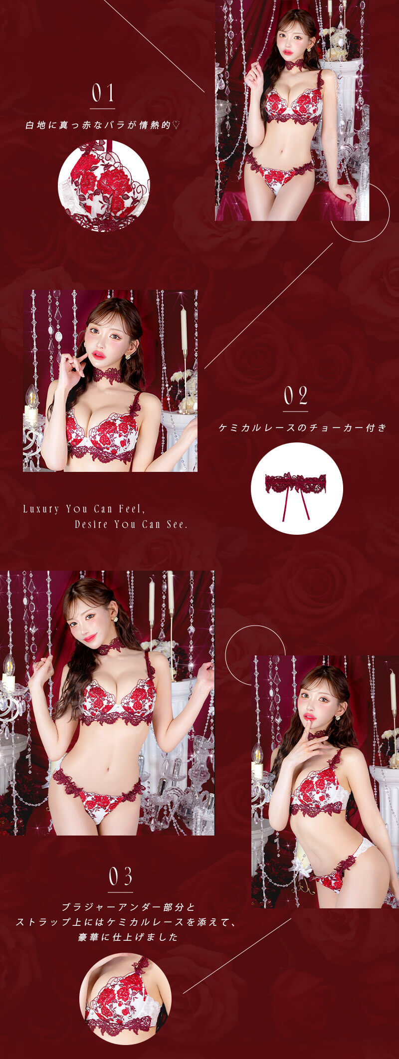 ショーツサイドにも贅沢にケミカルレースを使用。フェイクリボンでセクシーさをプラス。ケミカルレースのチョーカーまでついてきます!!勝負の日にオススメのランジェリーです!