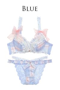 ラメ糸が織り込まれた淡いブルー&ピンク系のタータンチェック柄が可愛い!アイドル衣装のようなフリフリたっぷりであざと可愛いランジェリー!