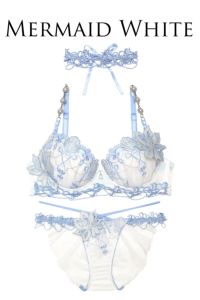 刺繍レース下にはオーロラ生地を挟んでいるので、水面の輝きを思わせる涼し気なランジェリーに仕上がりました!