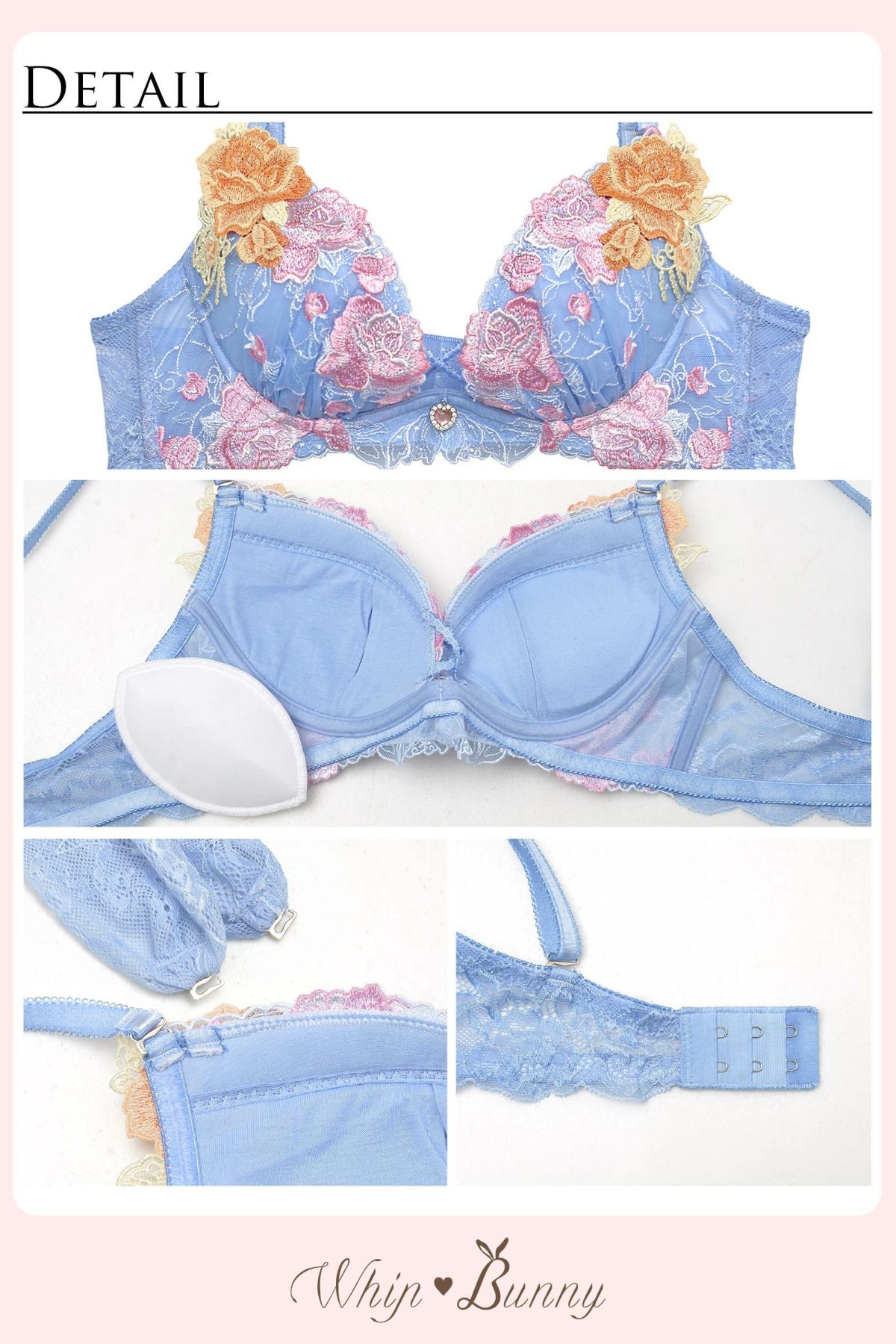 ブラジャー:後ろホック2段3列、ワイヤーあり(L字ソフトワイヤー)/ホック:バック2段3列/パッド:内蔵パッド:無、付属パッド:有、パッド受けあり、カップ透けなし/ストラップ:ストラップ取り外し不可、調節可、ホルターリボン付/取り外し可