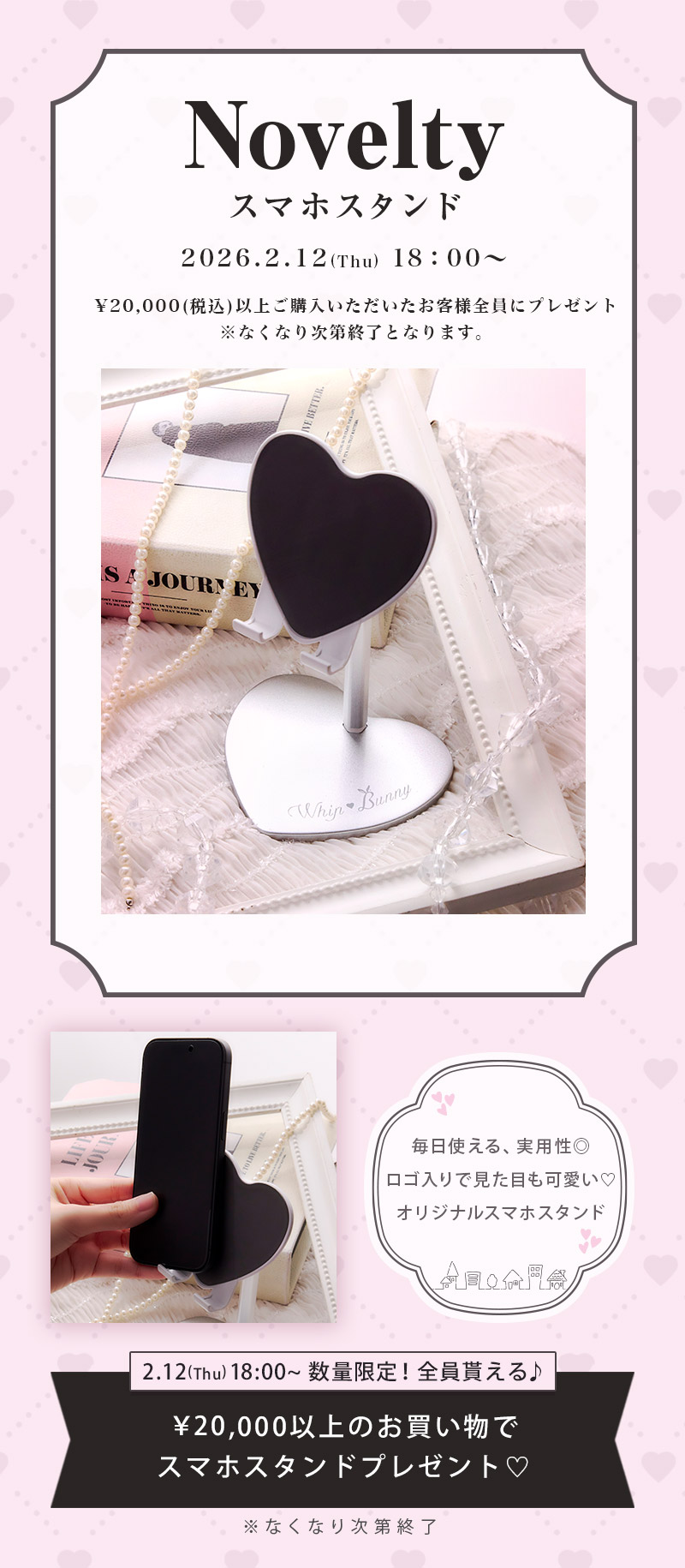 2/12 (Thu) 18:00~ノベルティプレゼント! ¥20,000以上のお買い物で早い者勝ち先着順にて オリジナル♥スマホスタンドをプレゼント✨